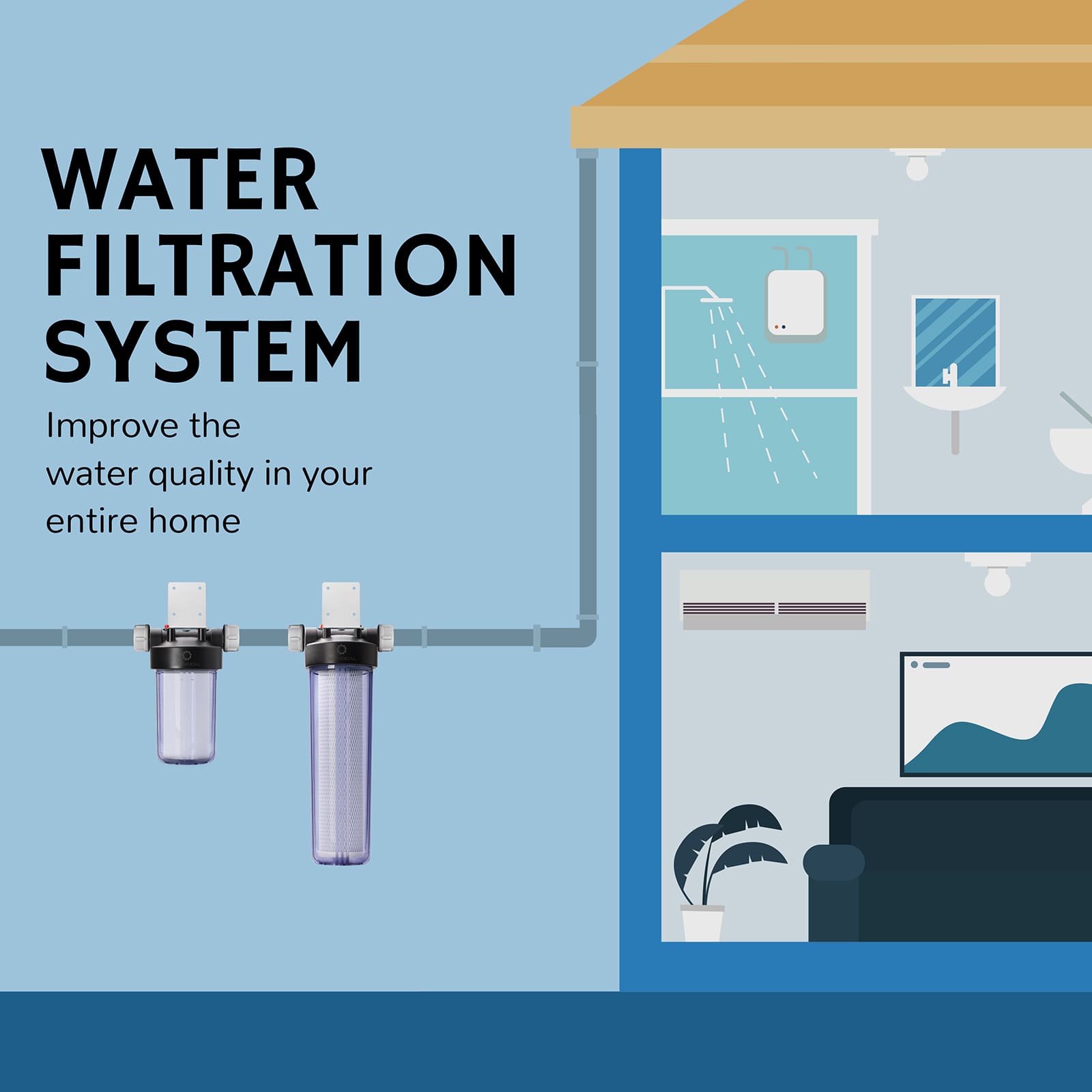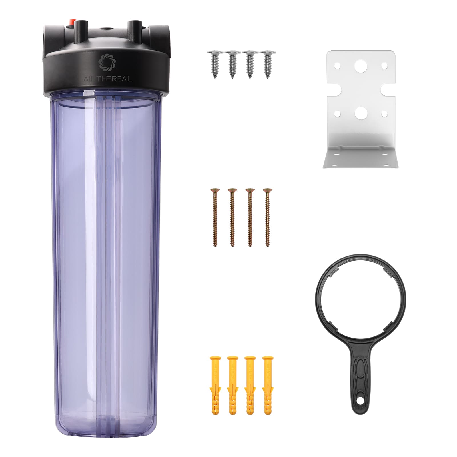 The housing comes complete with all necessary tools for installation, including a wrench, heavy-duty steel mounting bracket, and screws. It features a standard 3/4" or 1" NPT inlet and outlet, fitting most water lines. (Filter element and push connector need to be purchased separately.)