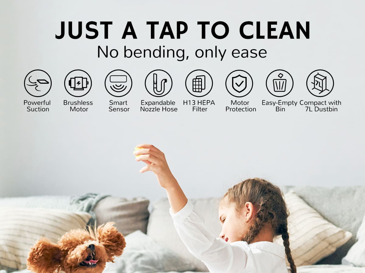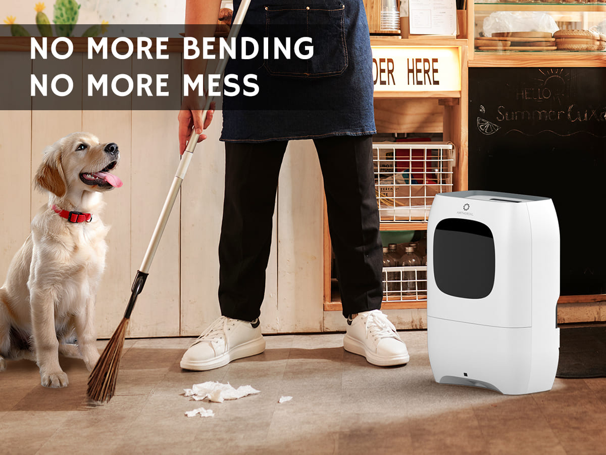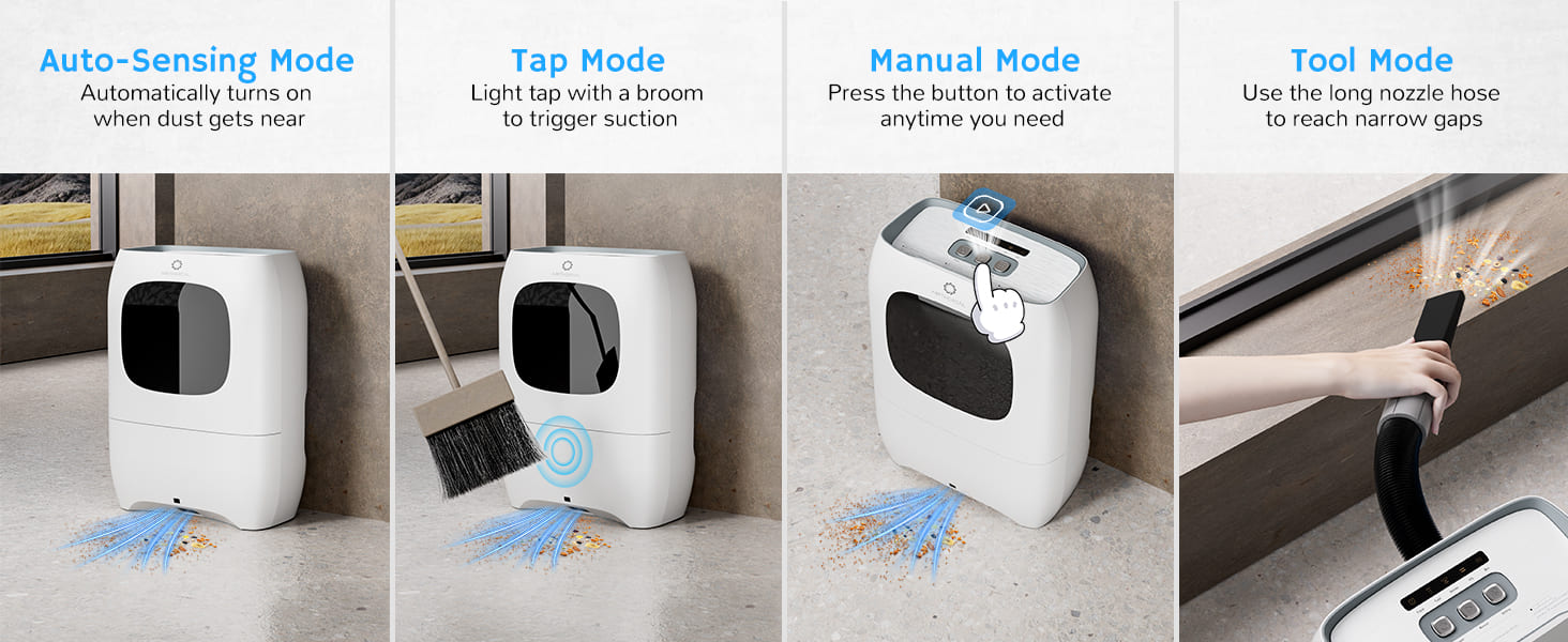The Touchless Vacuum Automatic Dustpan works via infrared detection or when the broom touches the sensing area.