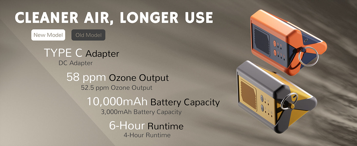 Best used in spaces up to 500 sq ft, the 1,000mg/h ozone output can run up to 4 hours on a full charge to remove tough odors, viruses, and bacteria in small areas like your car, office, bathroom, pet room, and more.