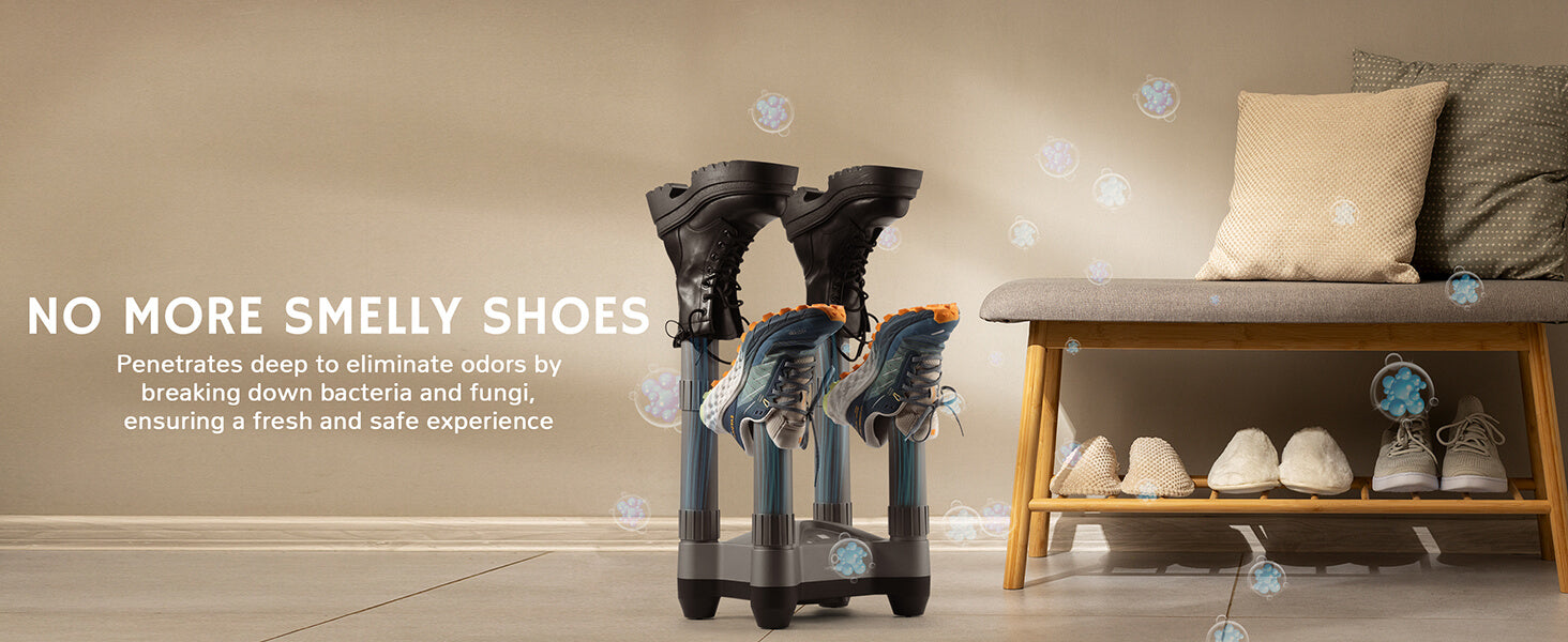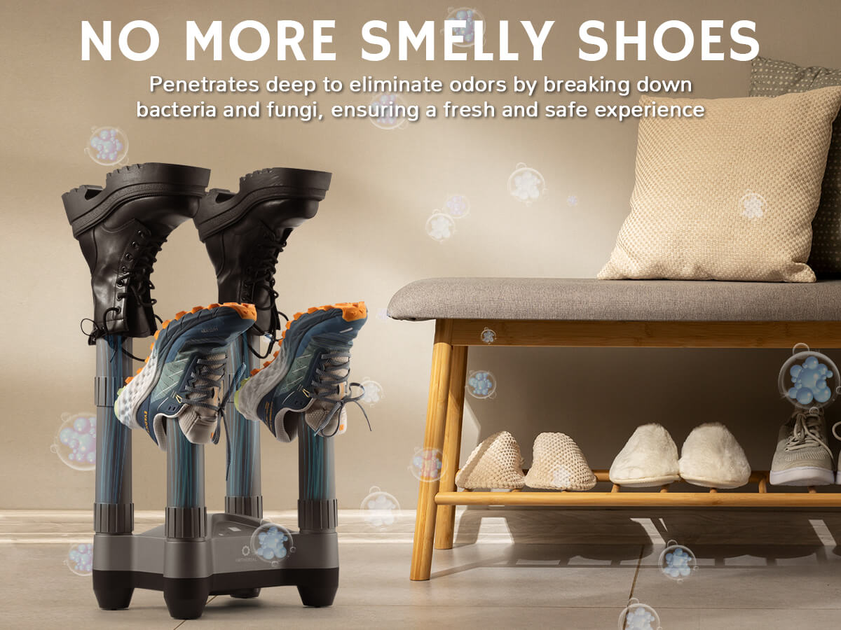 Unlike other boot and shoe heaters, our shoe dryer has a built-in ozone generator. It produces ozone to neutralize bad odors on boots, shoes, or other clothing while drying them.