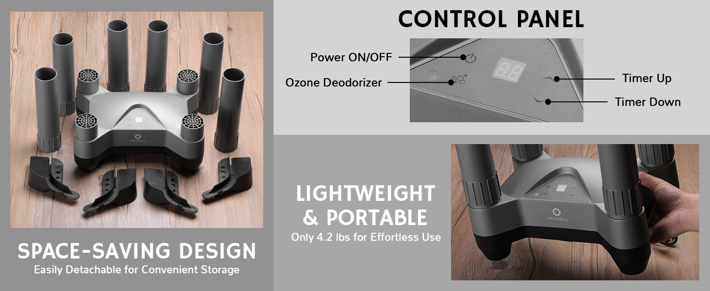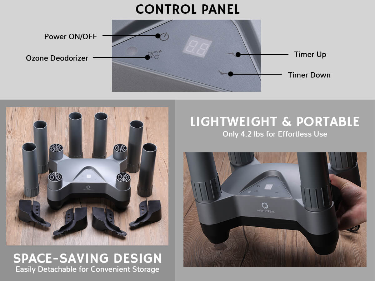 There are 4 removable, retractable dryer tubes to fit multiple types of boots, shoes, and gloves at the same time. It has multiple timer options and ozone function.